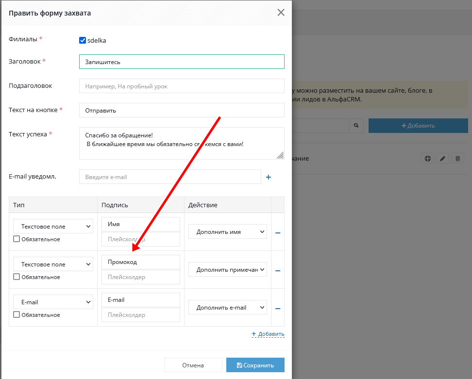Интеграция настроена, теперь при вводе партнёрского промокода в форму, в нашей системе будет создаваться партнёрская сделка.