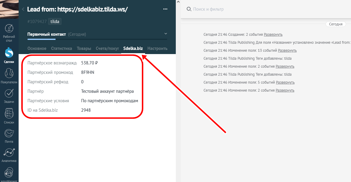После его установки - в карточке сделки amoCRM будут созданы дополнительные поля - "Партнёрский промокод", "Партнёрское вознаграждение", "Партнёр" и д.р. Которые будут обладать двухсторонней синхронизацией с соответствующими полями в личном кабинете Sdelka.biz.