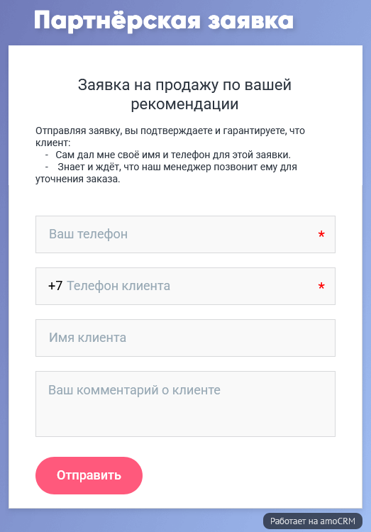 Для таких случаев вы можете создать специальную форму. Партнёр должен будет рассказать потенциальному клиенту о преимуществах вашего продукта или услуги и предупредить что с ним свяжутся от вашей компании, после этого отправить вам контакты этого клиента через такую форму.