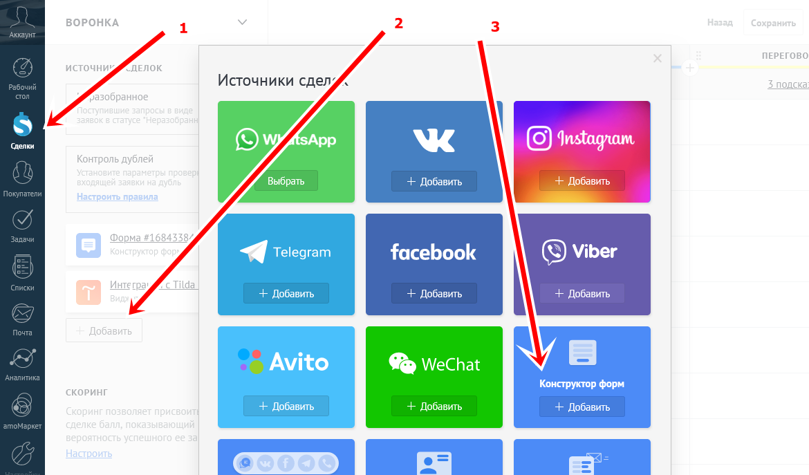 1 В левом боковом меню amoCRM перейдите в раздел «Сделки»(1). В этом разделе, в правом верхнем углу нажмите на кнопку «НАСТРОИТЬ» или «...» и там выберите «Настроить воронку». В открывшемся окне нажмите кнопку «Добавить»(2) и в следующем окне, в плитке «Конструктор форм» - нажмите «Добавить»(3)