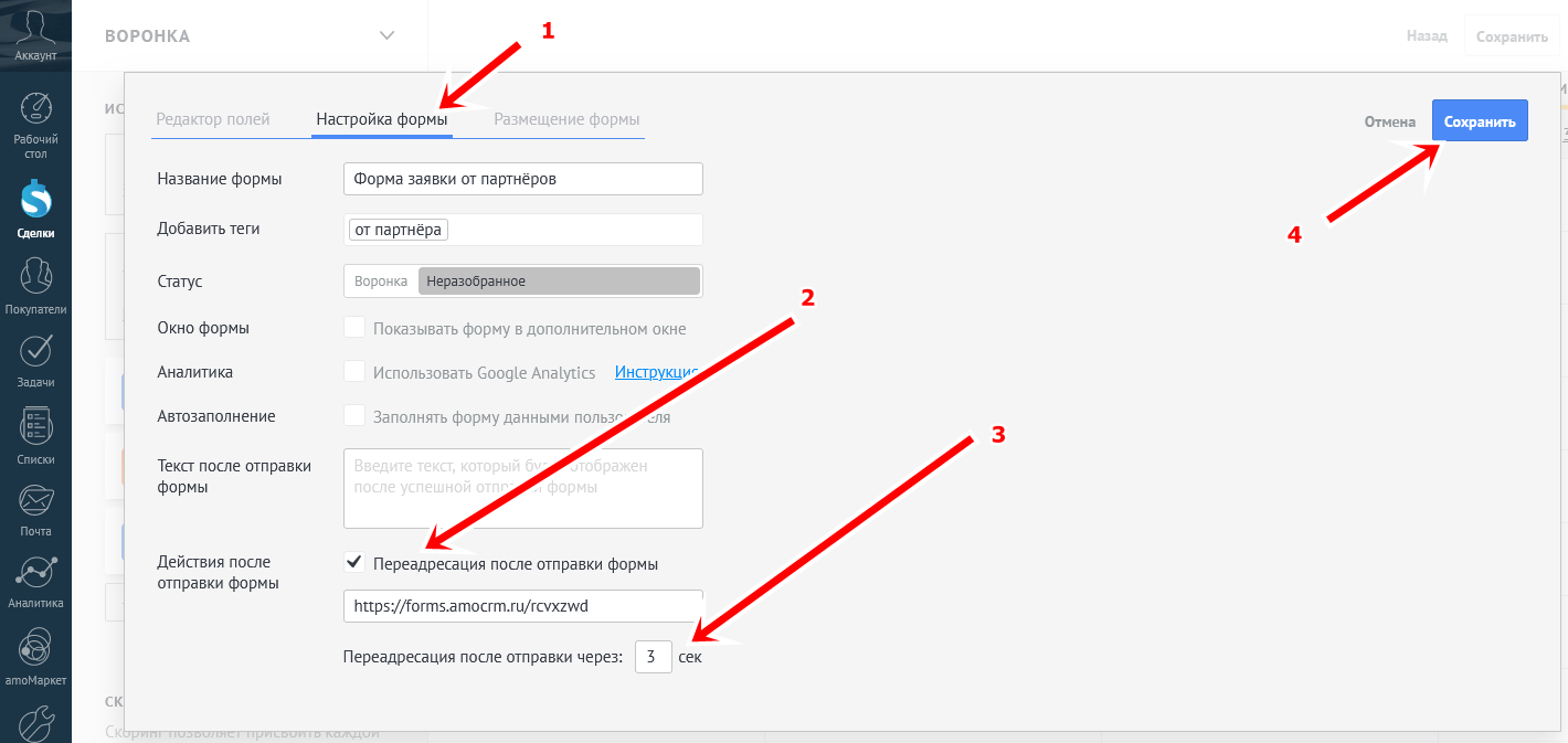 6 Далее нужно вернуться на вкладку «Настройка формы»(1), поставить галочку «Переадресация после отправки формы»(2) и вставить скопированный url формы, а в поле «Переадресация после отправки через»(3) указать - 3 сек. Далее ещё раз нажмите кнопку «Сохранить»(4)