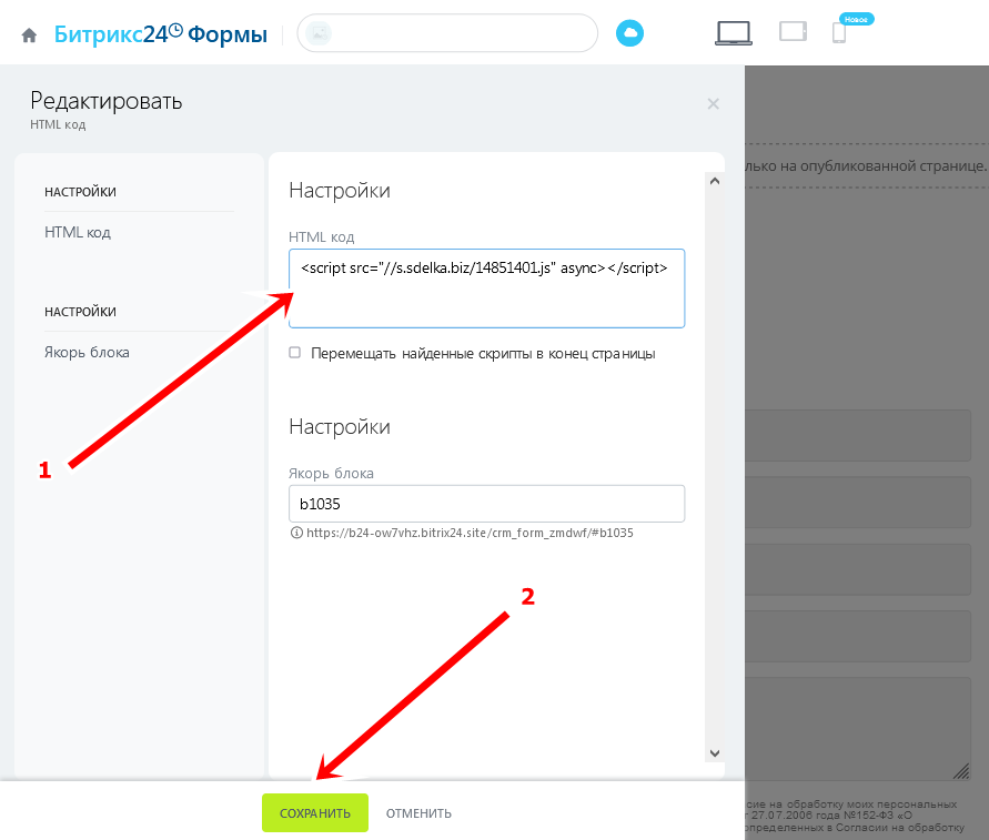 В зависимости от того, создаётся сделка или лид по результатам заполнения формы, выберите соответствующую вкладку в левом меню (2).