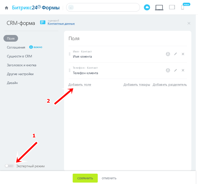 Удалите лишние поля, Нажмите «Включить экспертный режим» (1) и нажмите Добавить поле (2):