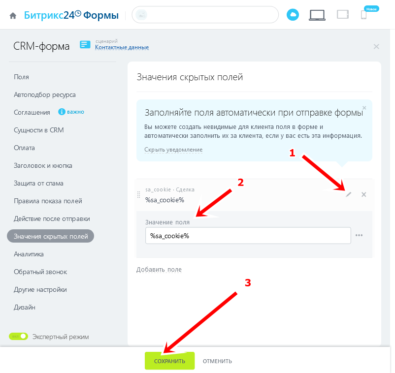 8 Нажмите на значок редактирования поля (1) и в Значение поля укажите параметр - %sa_cookie% (2). Затем нажмите кнопку Сохранить (3).