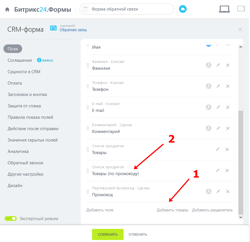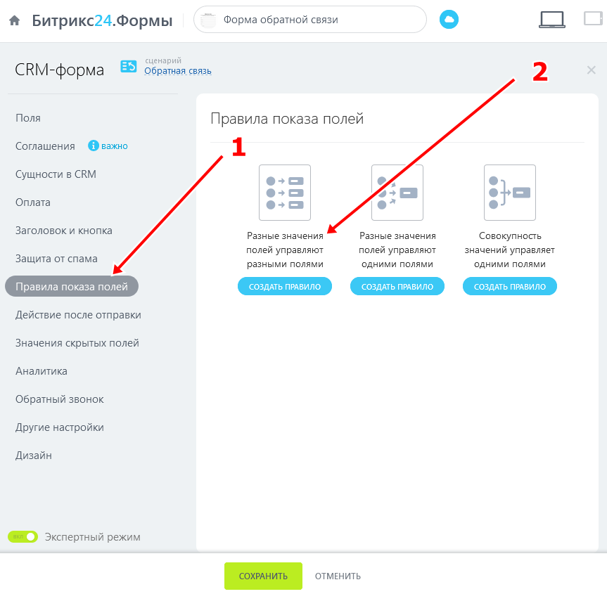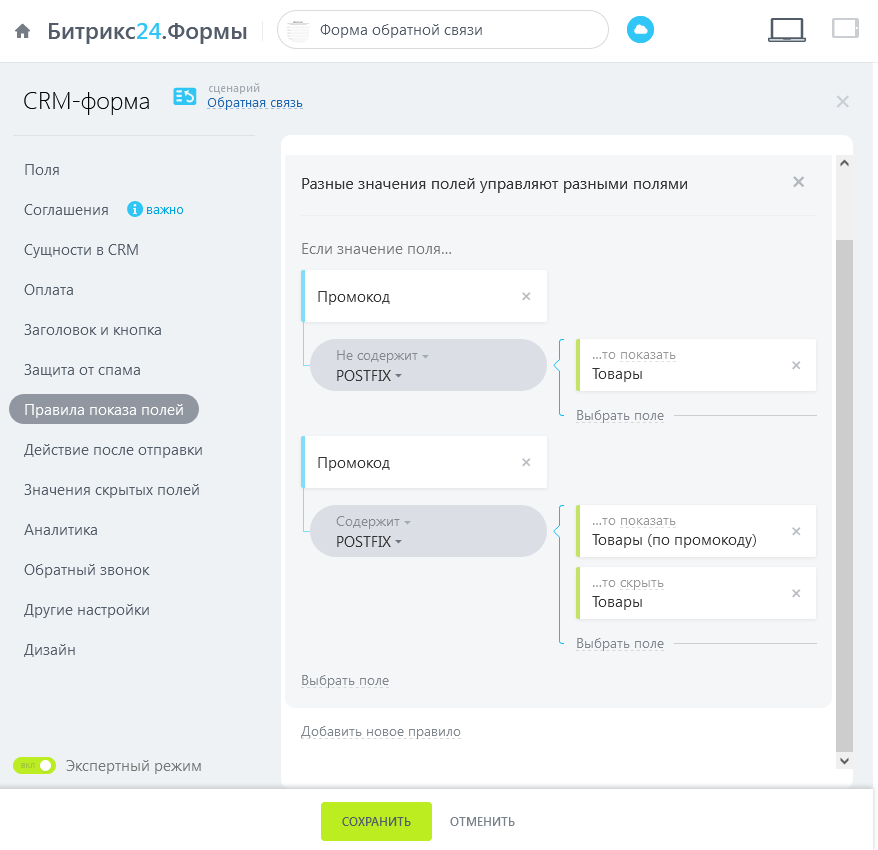 3 Далее необходимо перейти на вкладку Правила показа полей и добавить правило показа товарных полей: