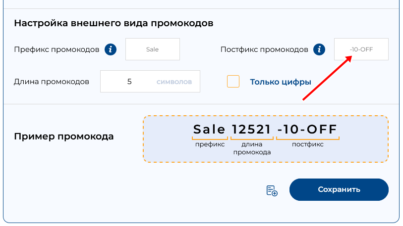 4 По следующей схеме, где POSTFIX - это постфикс промокода, который вы указали в настройках условиях сотрудничества, затем не забудьте нажать сохранить.